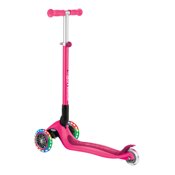 Ciesz się rozświetlonymi dniami na hulajnodze dzięki PRIMO FOLDABLE LIGHTS! Ta 3-kołowa hulajnoga ma przednie koła ze świecącymi diodami LED, które migają na niebiesko, zielono i czerwono, zapewniając kolorową jazdę przez cały dzień. Nie są potrzebne żadne baterie, ponieważ podświetlane koła korzystają z oświetlenia na dynamo — działają wyłącznie dzięki energii kinetycznej wytwarzanej przez moc hulajnogi.
