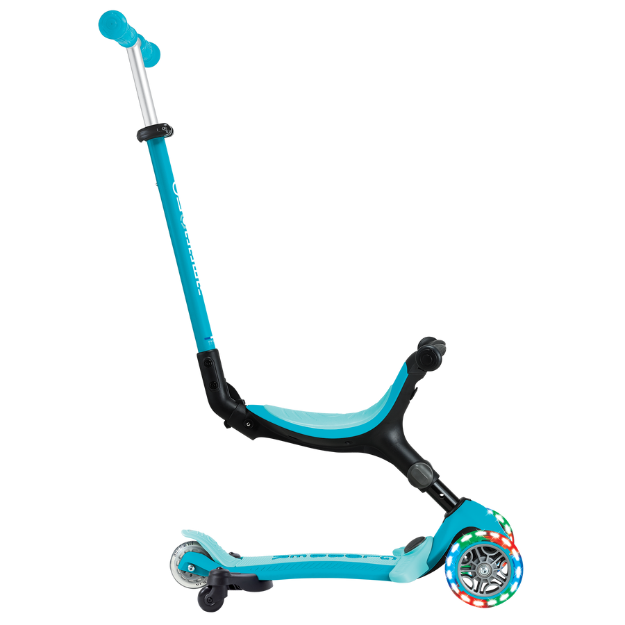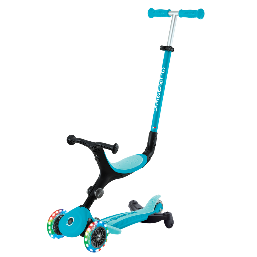 GO•UP ACTIVE LIGHTS 360° jest wyposażony w opatentowany przez Globber dodatkowy, tylny moduł kół, który umożliwia łatwe sterowanie 360° przez rodzica w trybie jazdy z prowadnikiem.