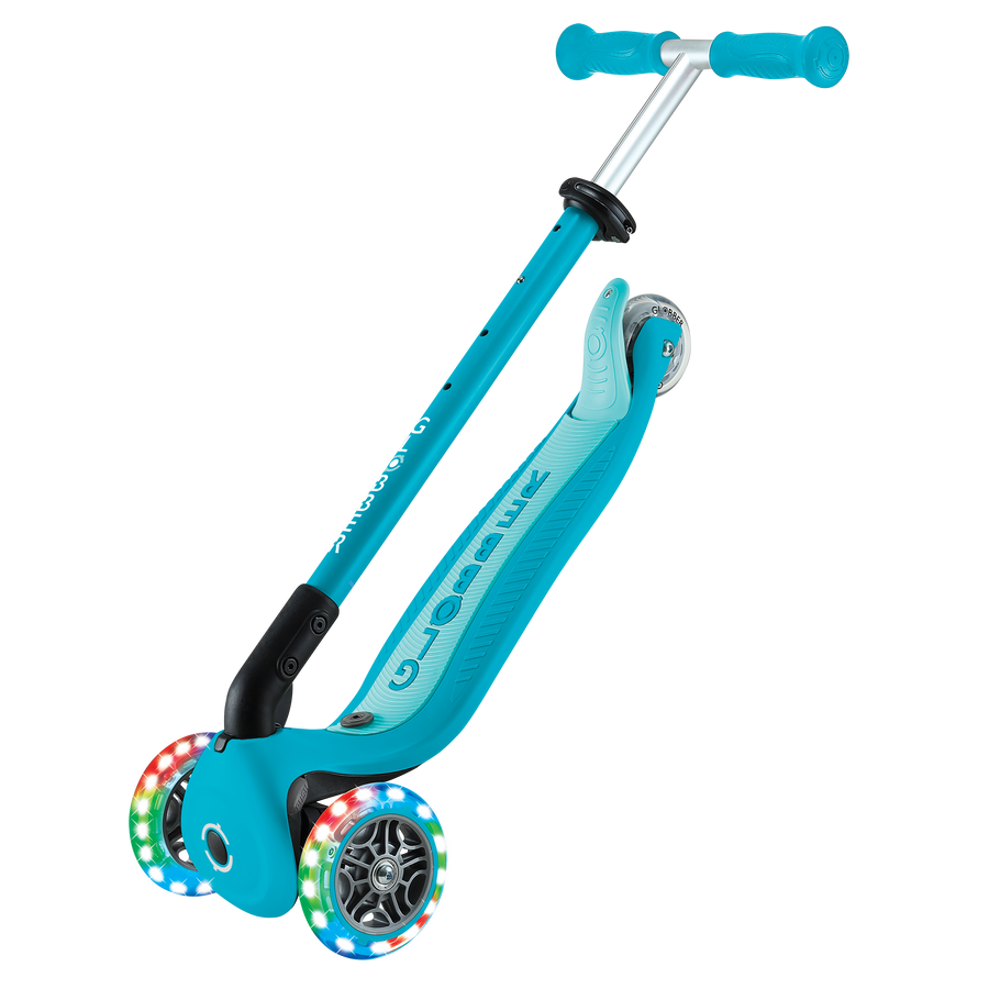 GO•UP ACTIVE LIGHTS 360° jest wyposażony w opatentowany przez Globber system blokady kierownicy, który blokuje przednie koła hulajnogi, aby poruszały się tylko do przodu i do tyłu, dzięki czemu dzieci nabierają pewności siebie podczas jazdy, ćwicząc jednocześnie równowagę. Aby przejść w tryb pełnej jazdy i włączyć jazdę z pochyleniem i skrętem, wystarczy zwolnić przycisk blokady kierownicy znajdujący się na podstawie pokładu hulajnogi!