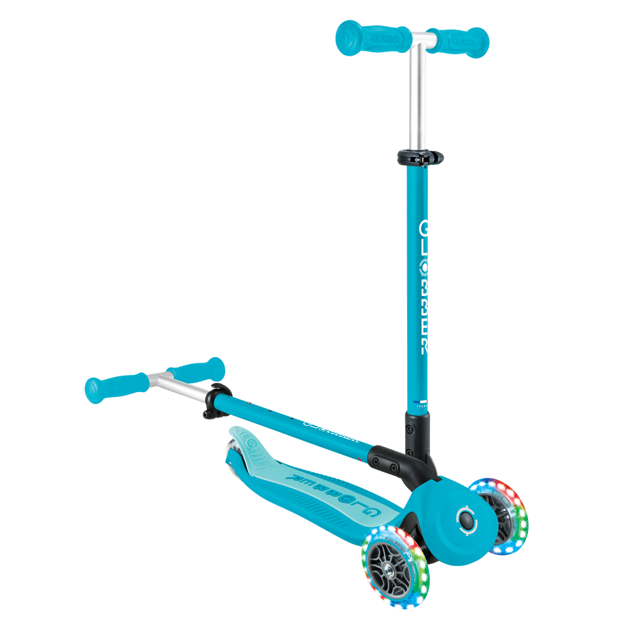 Bez wysiłku przenoś i przechowuj swój GO•UP ACTIVE LIGHTS 360° w kompaktowych przestrzeniach! Wyposażony w opatentowany system składania, ten 3-kołowy, składany pojazd można łatwo złożyć w tryb wózka, aby go nosić lub toczyć po dniu pełnym wrażeń na hulajnodze.