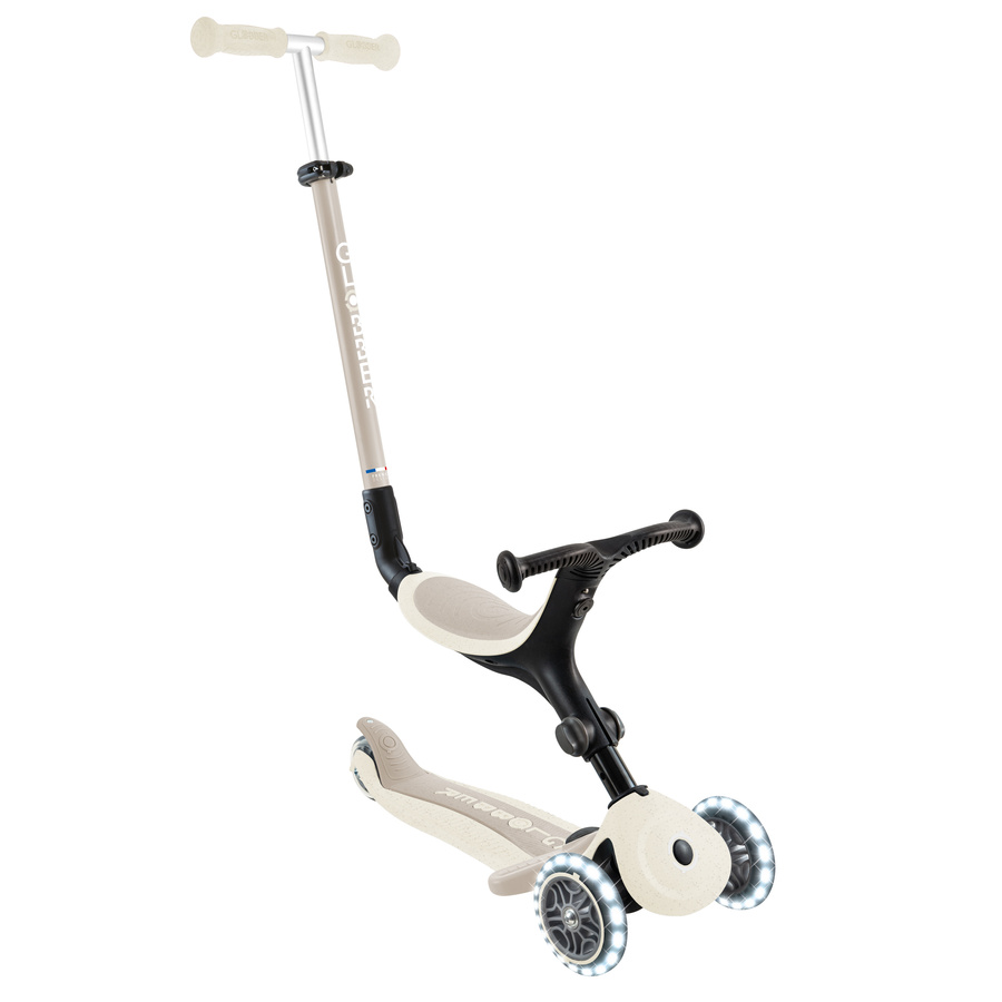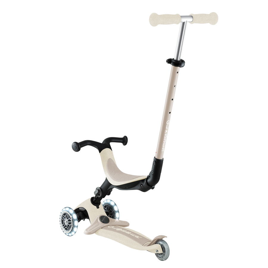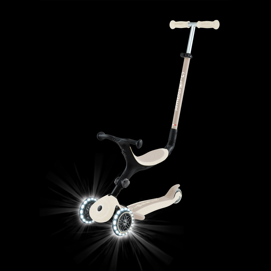 - Wielofunkcyjna hulajnoga z siedziskiem, wykonana w 100% z plastiku GRS, wyposażona w świecące kółka