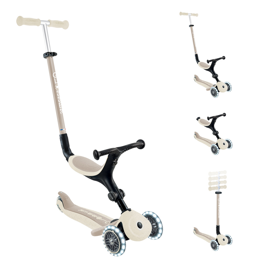 To 3-kołowa, świecąca hulajnoga eko z siedziskiem, która rośnie z dzieckiem: działa jako jeździk (15–36 mies.), rowerek chodzony (15–36 mies.) oraz hulajnoga (3–9+ lat). Zachowuje wytrzymałość kultowego oryginału, a jednocześnie wykorzystuje więcej materiałów eko dla mniejszego śladu środowiskowego.