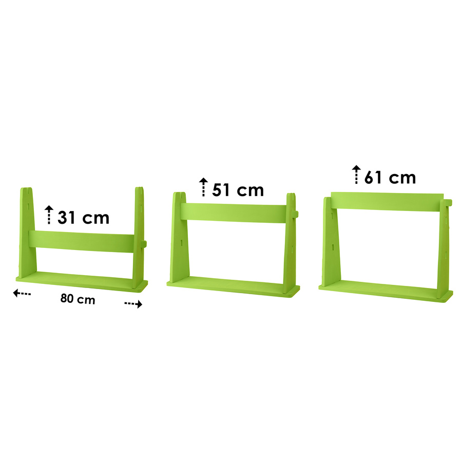 Możliwość ustawienia płotka na trzech poziomach wysokości (31 cm, 51 cm, 61 cm) pozwala dostosować intensywność ćwiczeń do wieku, umiejętności i potrzeb uczestników. Składana konstrukcja sprawia, że płotek jest łatwy w transporcie i przechowywaniu, a jaskrawy zielony kolor zwiększa jego widoczność na każdej nawierzchni.