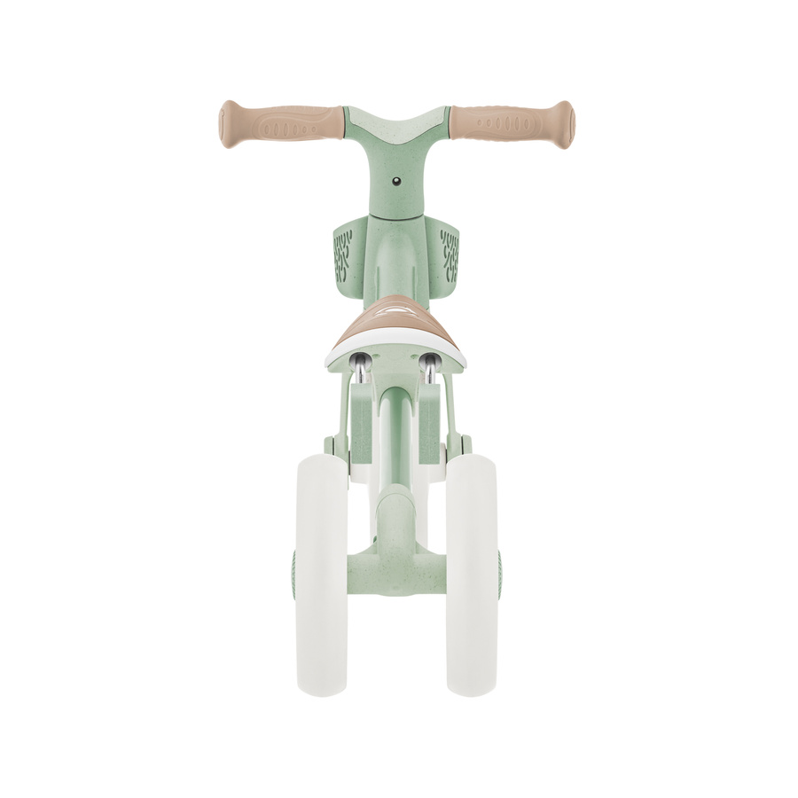 Model ma 100% beznarzędziową konstrukcję, siodełko z regulacją 2-stopniową, zdejmowane elementy (koszyczek i pedały), trwałą ramę, ergonomiczne chwyty TPR i lekkie koła EVA. Wykonany z GRS i dodatku włókien roślinnych*.