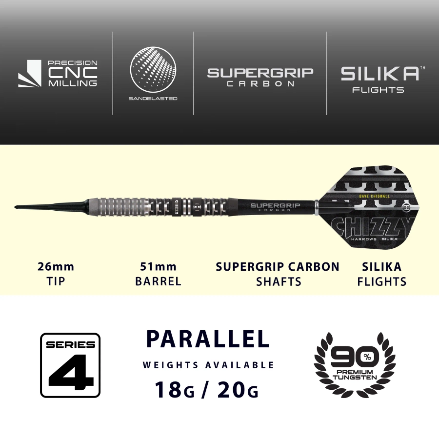 - Chizzy 90% Series 4 Soft Tip – profesjonalne lotki z wolframu 90%, z plastikową końcówką do tarcz elektronicznych. Piaskowana powierzchnia, świetny grip i wyważenie.