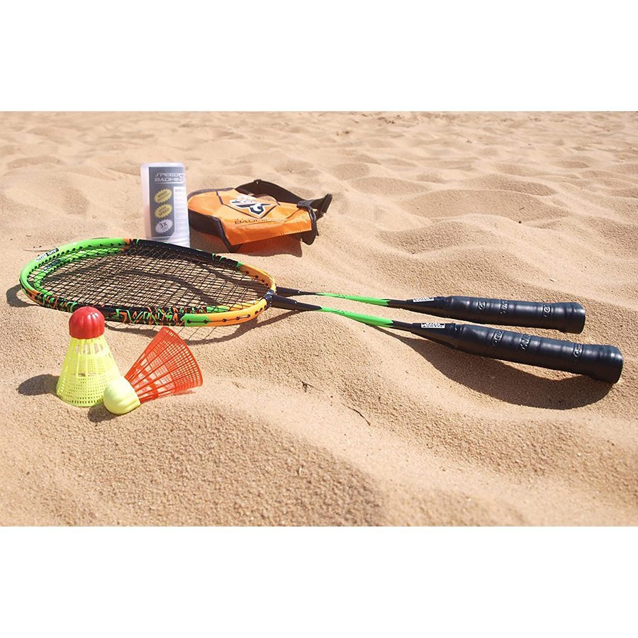 - 2 aluminiowych, krótszych, niż tradycyjne, badmintonowych rakiet (58,5cm), z bardziej wytrzymałym niż do badmintona naciągiem (ze względu na cięższe lotki)