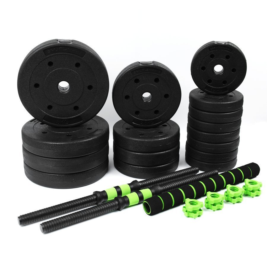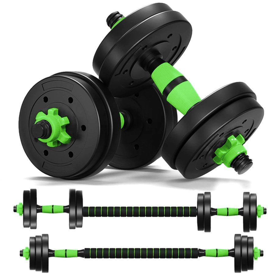 - Zestaw hantli z drążkiem łączącym do sztangi – regulowana waga, antypoślizgowe uchwyty, piankowy gryf. W zestawie: 4×5 kg, 4×2,5 kg, 8×1,25 kg, gryfy i nakrętki. Idealny do domowych treningów siłowych.